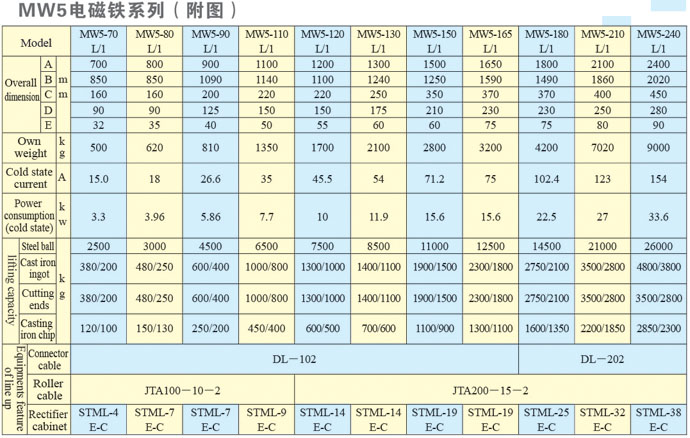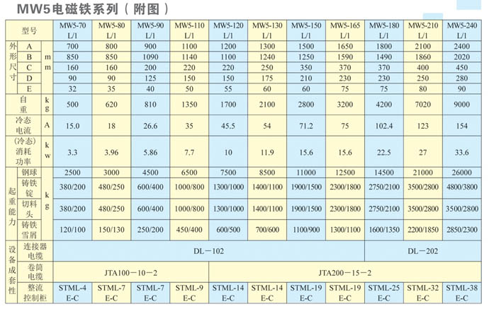 选型注意事项 1、吸运物料温度低于100℃时,请选用常温型,超过100℃时,请选用高温型。 2、通电持续率超过60%时,请选用高频型。 3、水中吸吊物料时,请选用潜水型(潜水深度100m)。潜水型电磁铁其参数与常温型相同。因此样本中未列出,如用户需潜水型,请在订货时说明。 4、周围环境温度:常温型-5℃~40℃,高温型-5℃~80℃。海拔高度不超过2000m。 5、设备配套:整流控制设备功率(电流)大于或等于单台或多台联用的冷态功率(电流)之和。